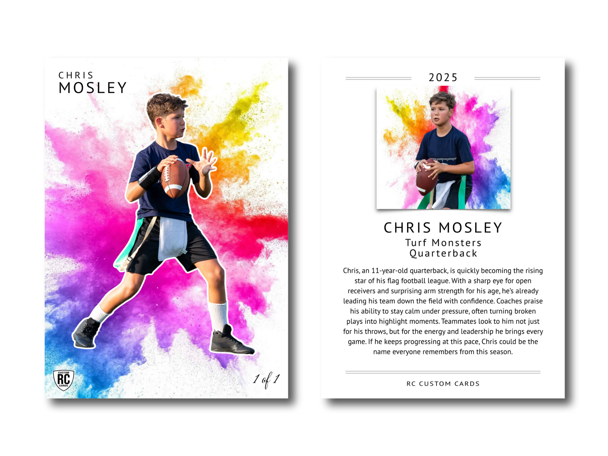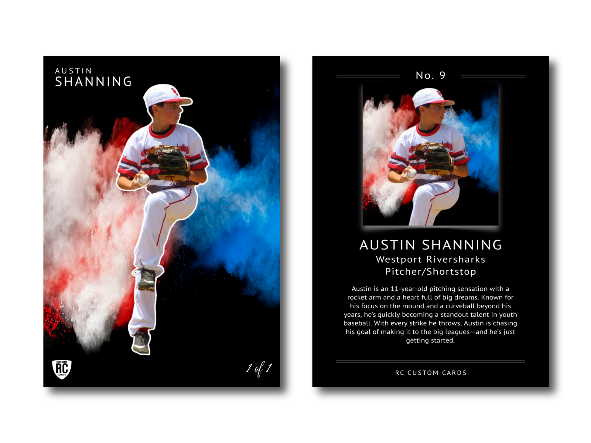 Have a picture you want turned into a graded sports card? We've got you covered! Simply select from one of our 9 designs, add your name and picture, and you're set! If you want to spice things up, feel free to add one of our three special finishes, holographic, cracked ice, or sparkle, and your personalized stats on the back.