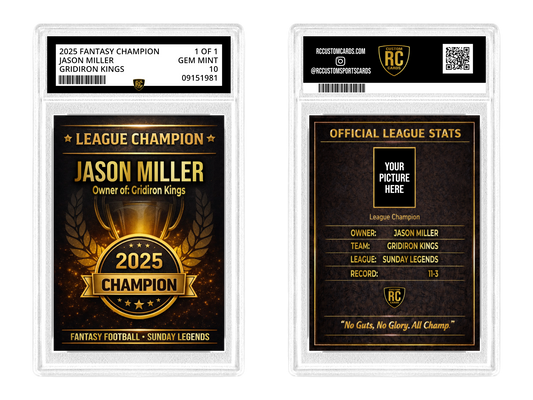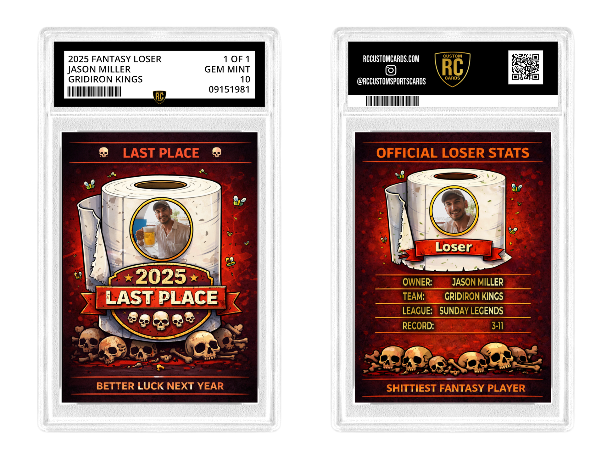 Immortalize your league’s biggest disappointment with the Last Place Fantasy Football Card — a hilarious, high-quality collectible designed to roast your league’s loser forever.